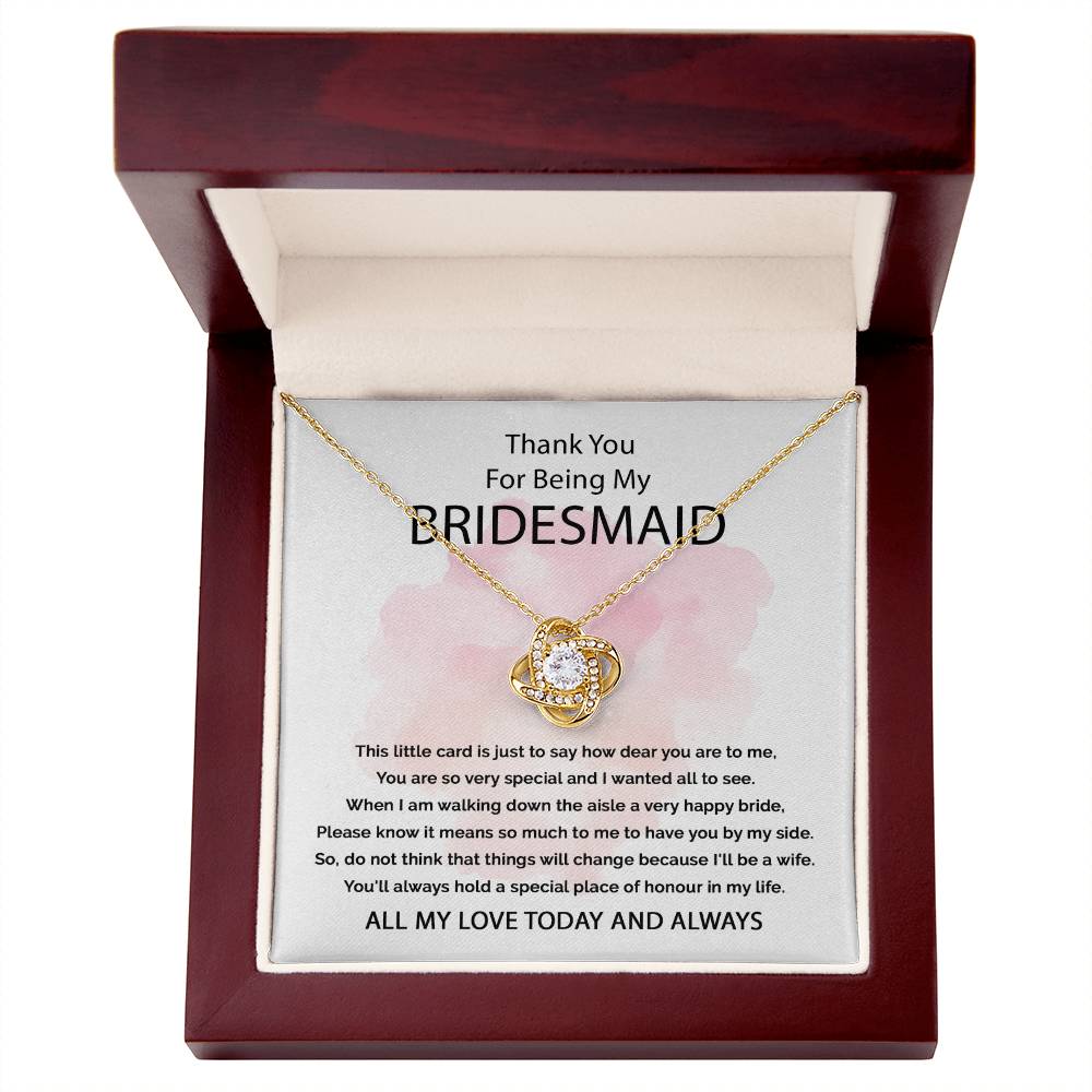 Imagine your Bridesmaid's reaction receiving this beautiful Love Knot Necklace, a symbol of the unbreakable bond and the memories you have created together. May it serve as a reminder of the incredible friendship you share, and the love and gratitude you will forever hold in your heart for her.