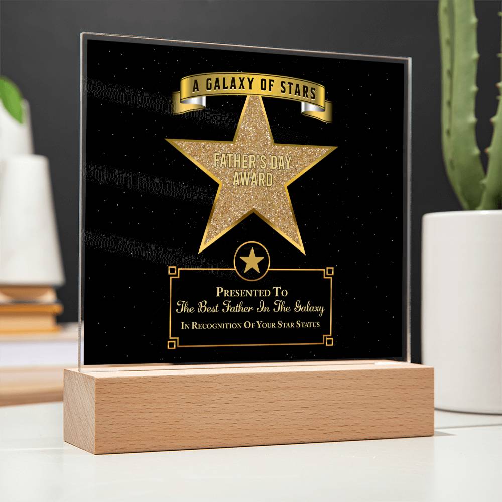 Our beautiful acrylic display plaque features a heartfelt message that will touch his heart. The message reads: "A Galaxy Of Stars Father's Day Award. Presented to the Best Father in the galaxy in recognition of your star status". Order now and let your Dad know that he is loved and appreciated!
