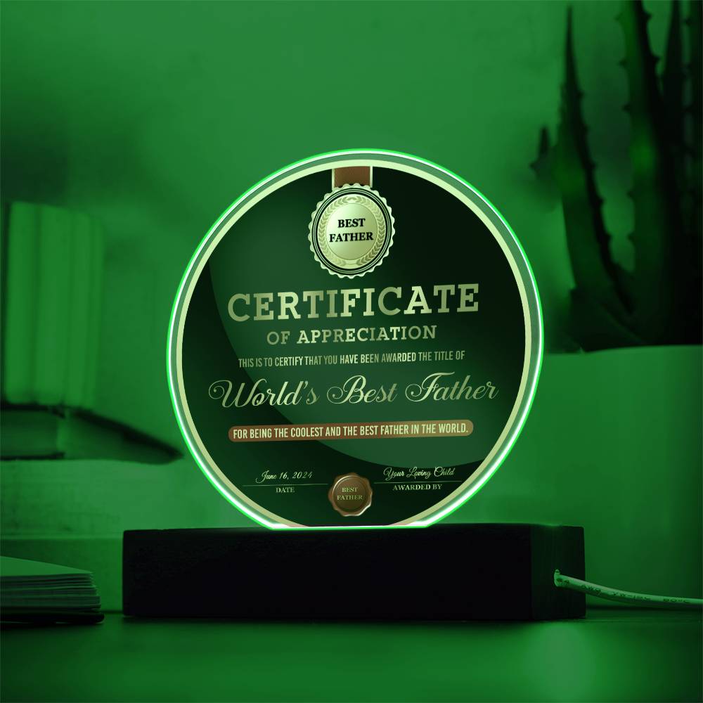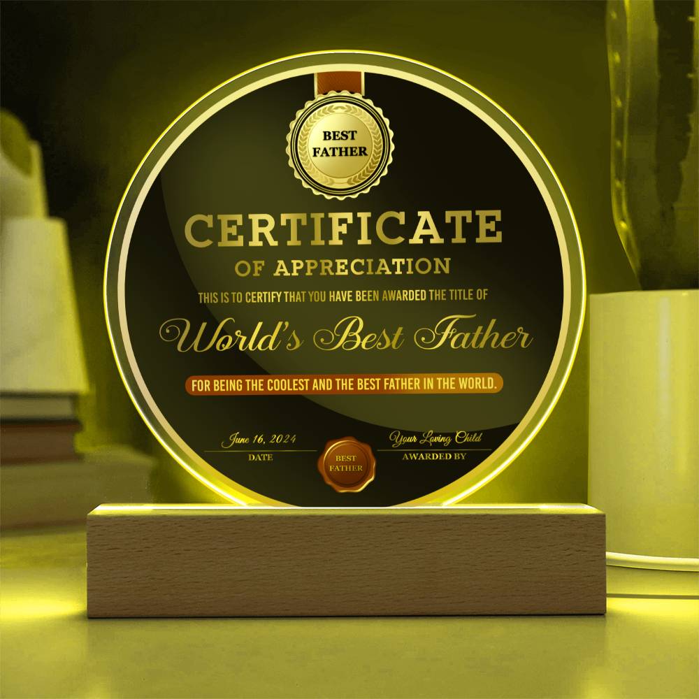 Our beautiful acrylic display plaque features a heartfelt message that will touch his heart. The message reads: "Certificate of Appreciation. This is to certify that you have been awarded the title of World's Best Father. For being the coolest and the best father in the world.". Order now and let your Dad know that he is loved and appreciated!