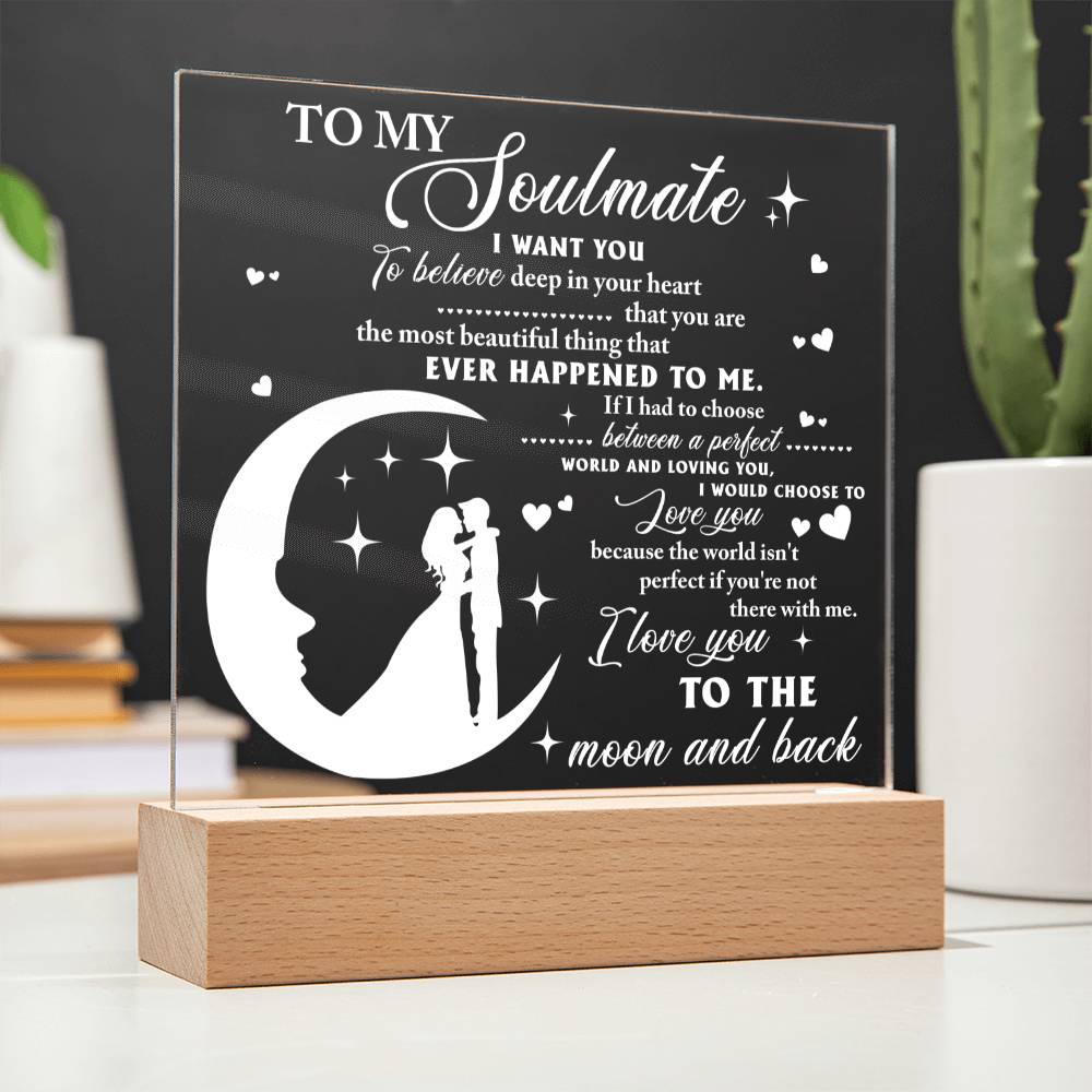 Heartwarming message to your soulmate reads: "To My Soulmate: I want you to believe deep in your heart that you arethe most beautiful thing that ever happened to me. f I had to choose between a perfect world and loving you, I would choose to love you because the world isn't perfect if you're not there with me. I love you to the moon and back."