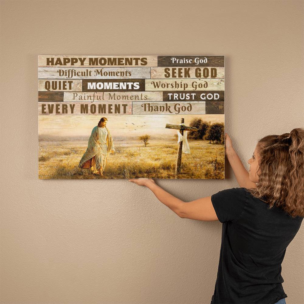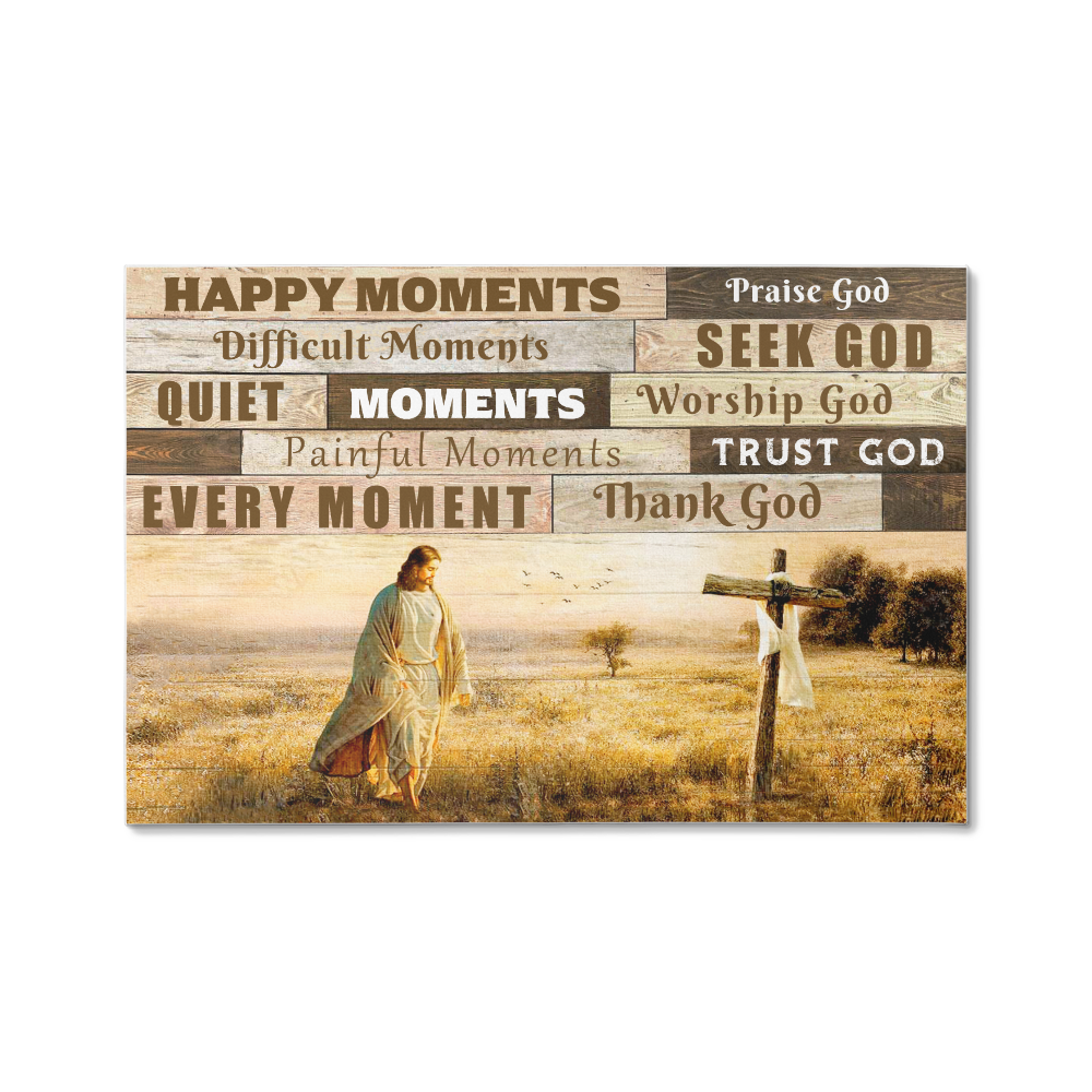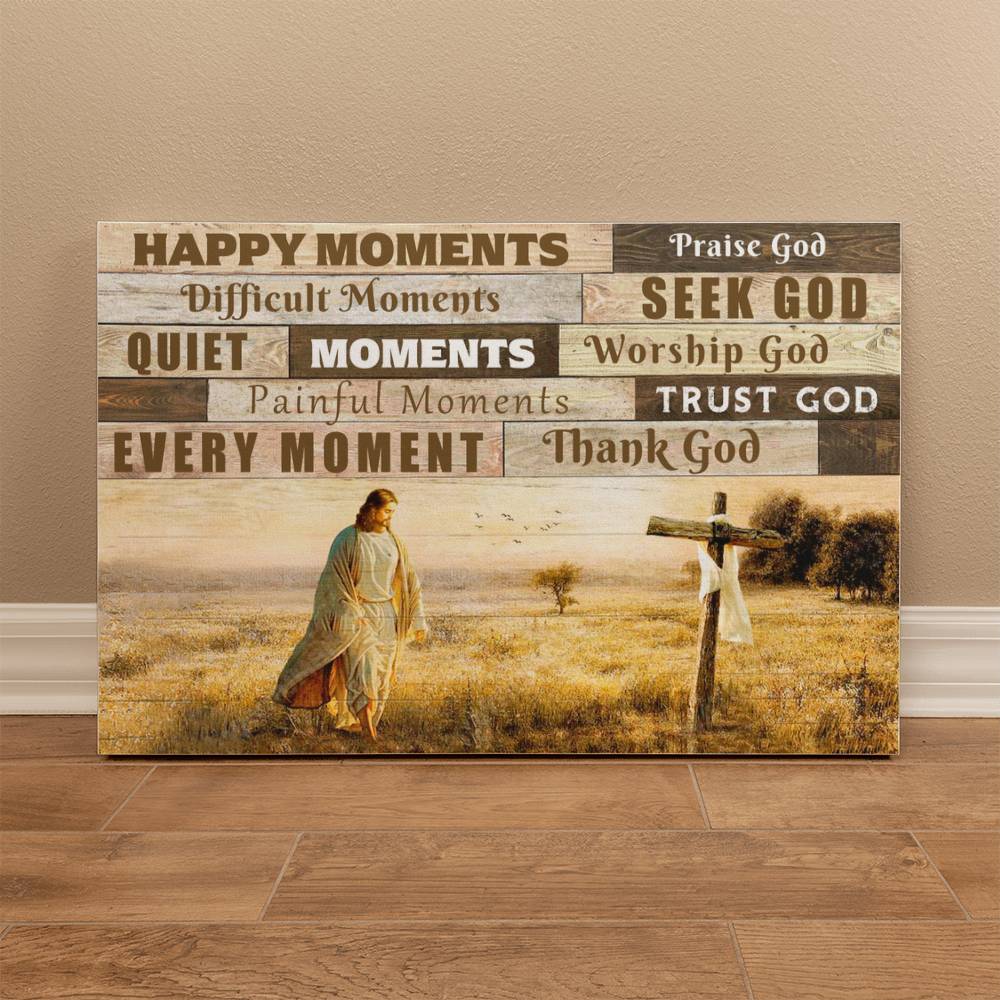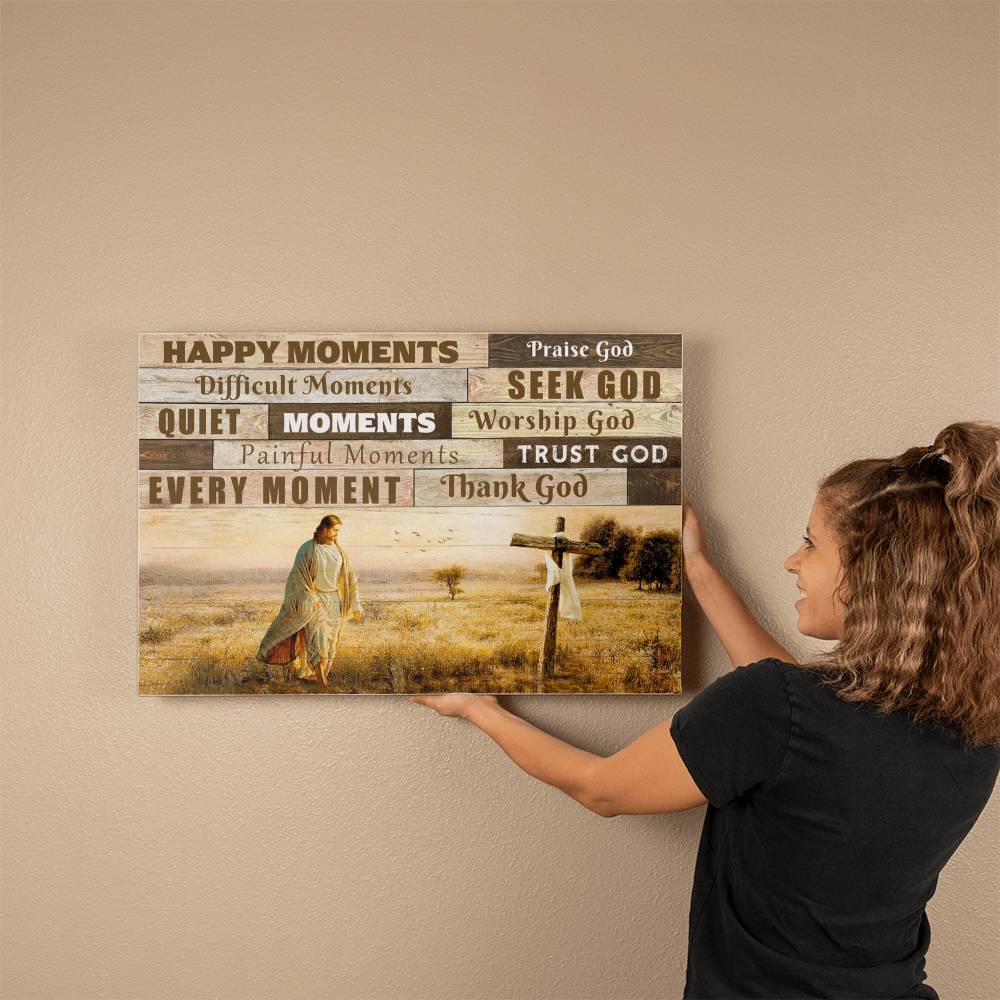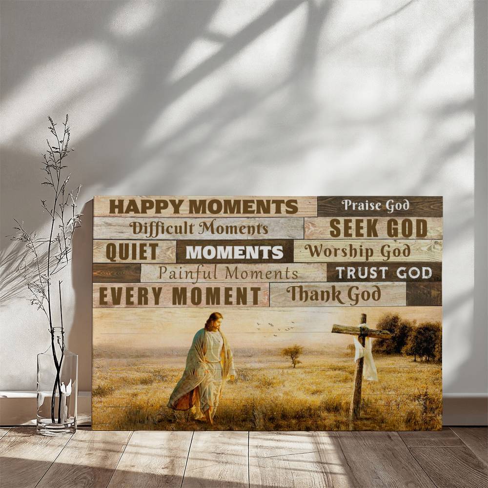 Enhance your space with this gallery-wrapped canvas, reminding you to praise God in happy times, seek Him in difficulties, worship during quiet moments, trust Him through pain, and give thanks every single day. Vibrant inks on a high-quality, wrapped canvas ensure the design remains beautiful in any room—from living areas to office spaces. Whether displayed at home or given as a heartfelt gift, its meaningful message will leave a lasting impression on all who see it.