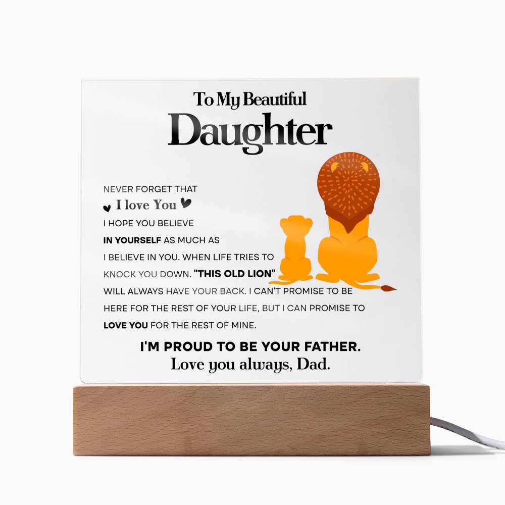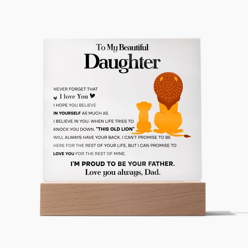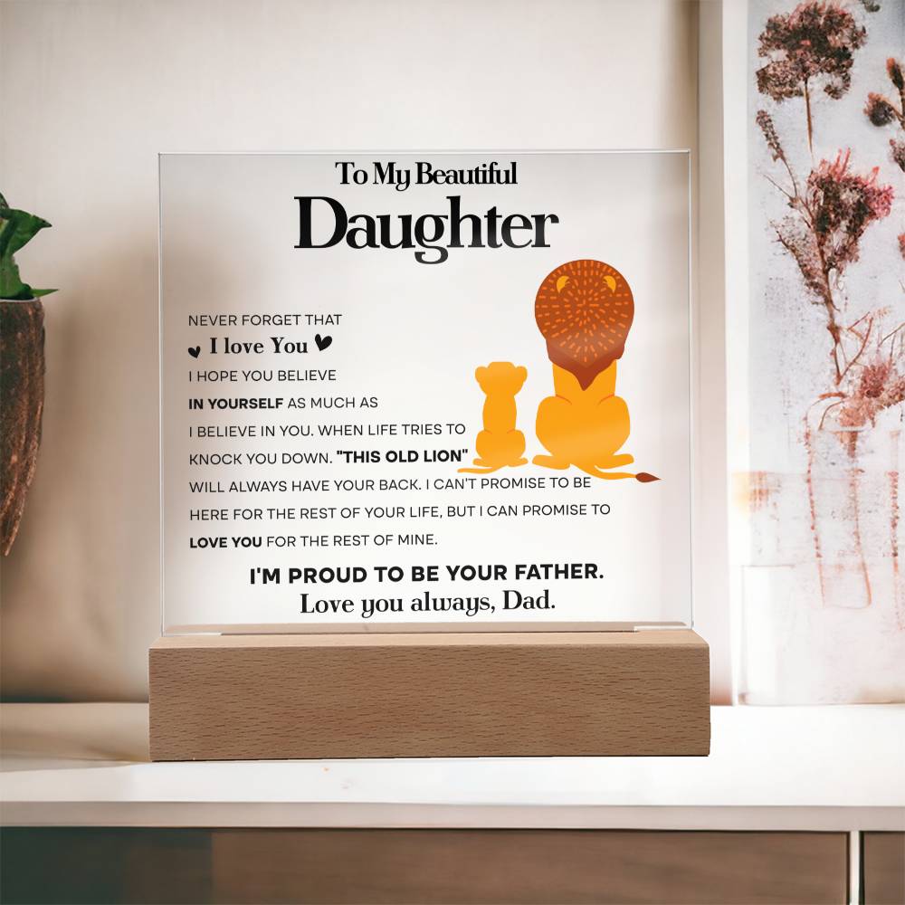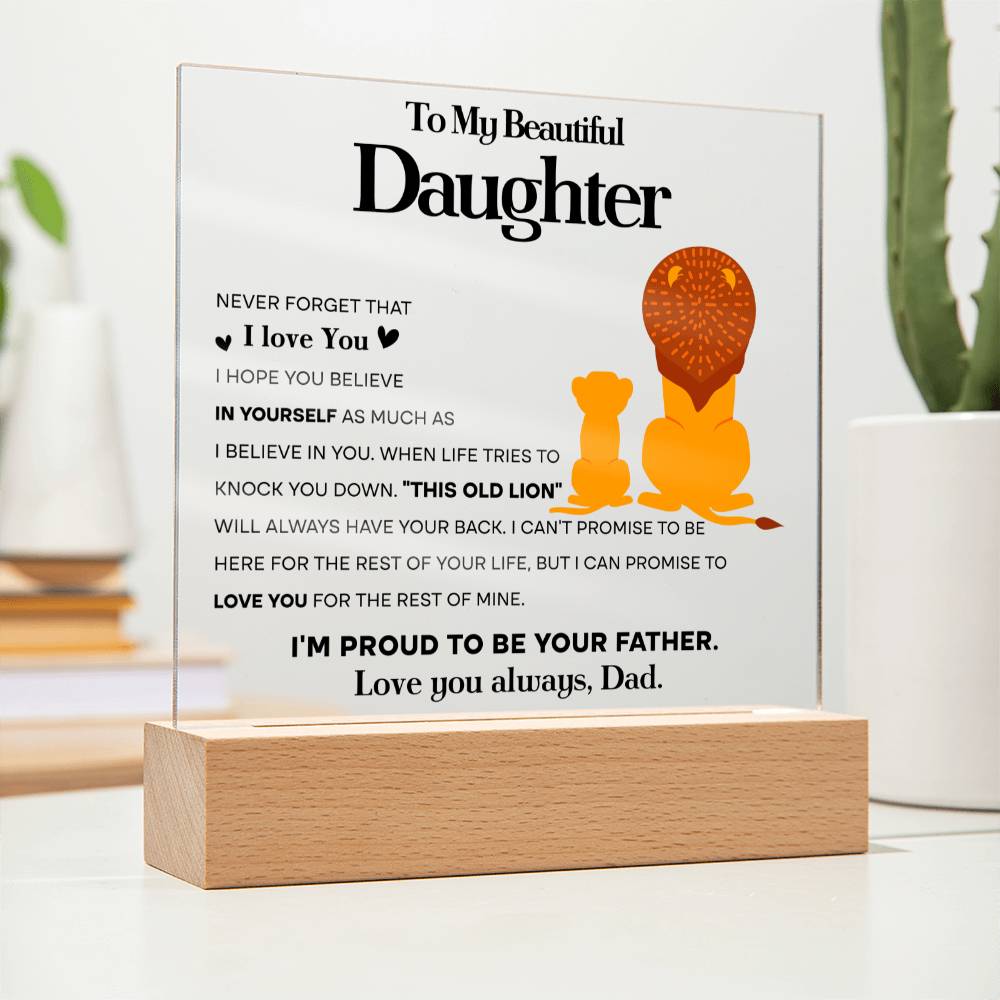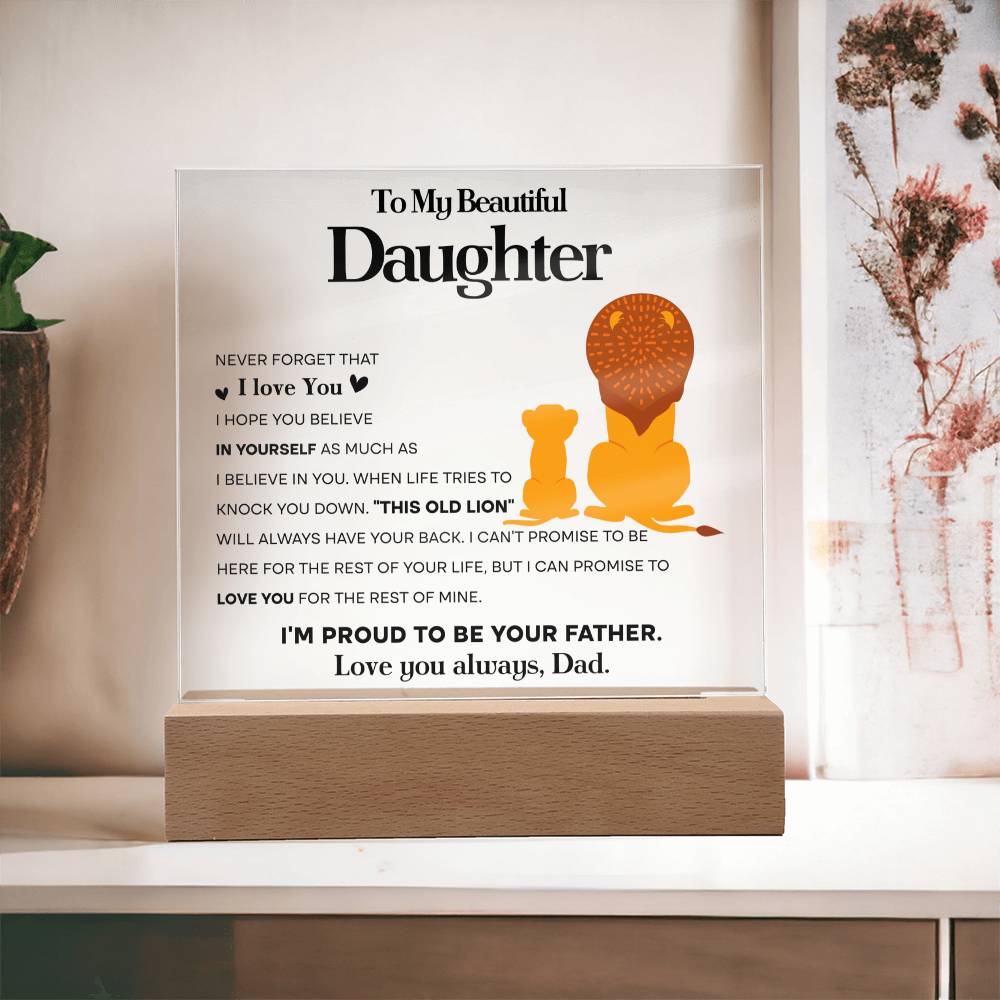 Our beautiful acrylic display plaque features a heartfelt message that will touch her heart. The message reads: "To My Beautiful Daughter: Never forget that I love you. I hope you believe in yourself as much as I believe in you. When life tries to knock you down. "This old lion" will always have your back. I can't promise to be here for the rest of your life, but I can promise to love you for the rest of mine. I'm proud to be your father. Love you always, Dad."