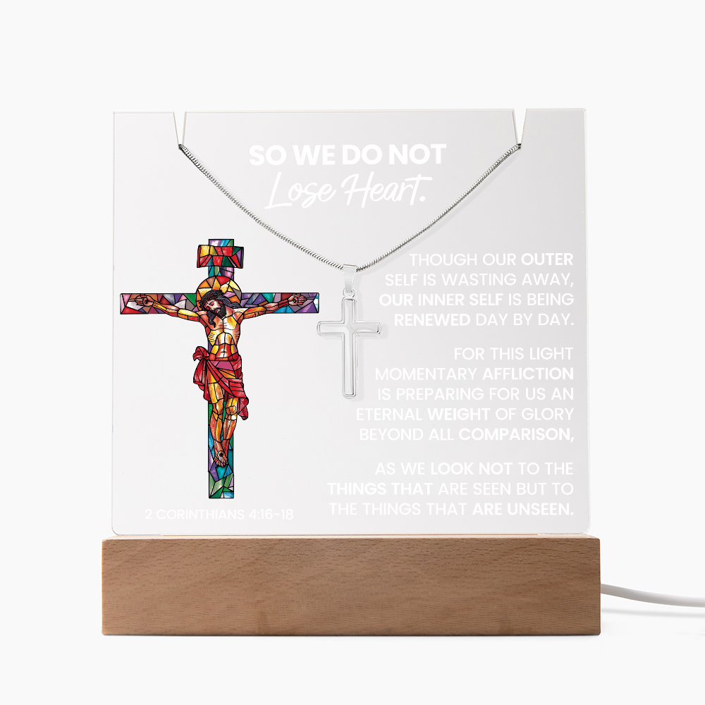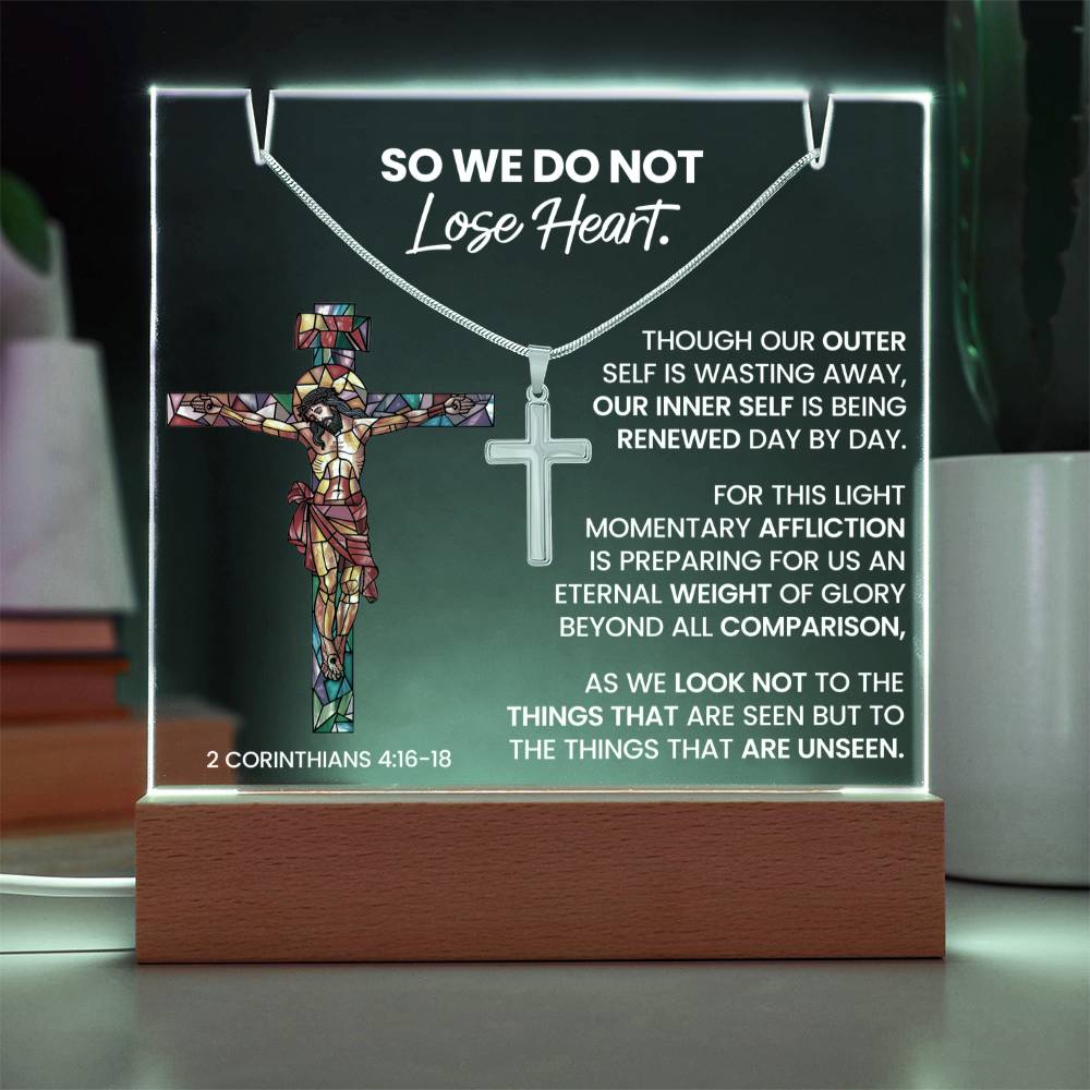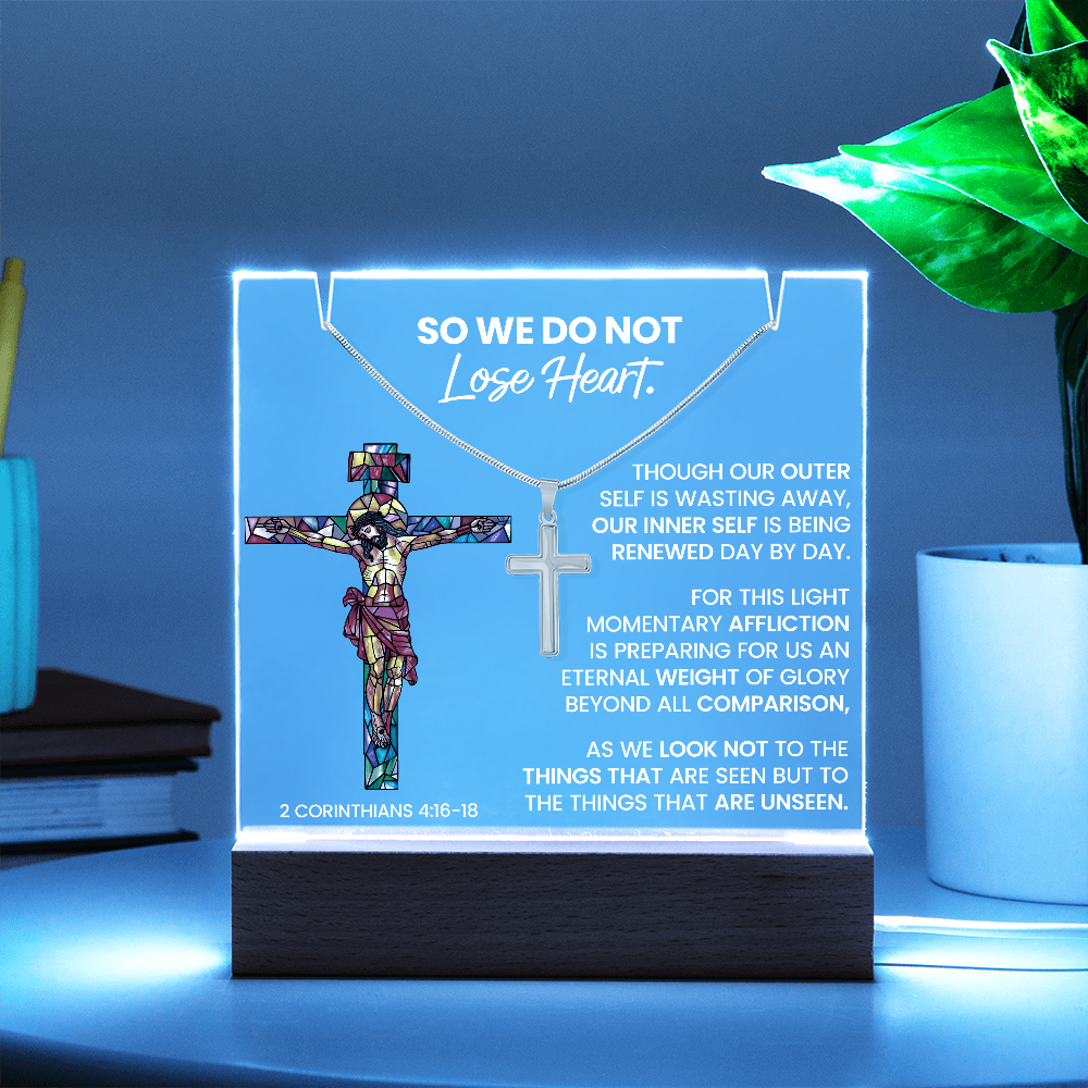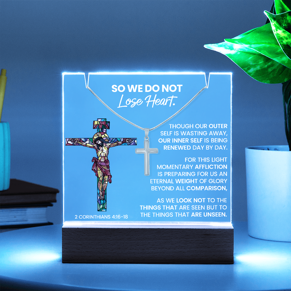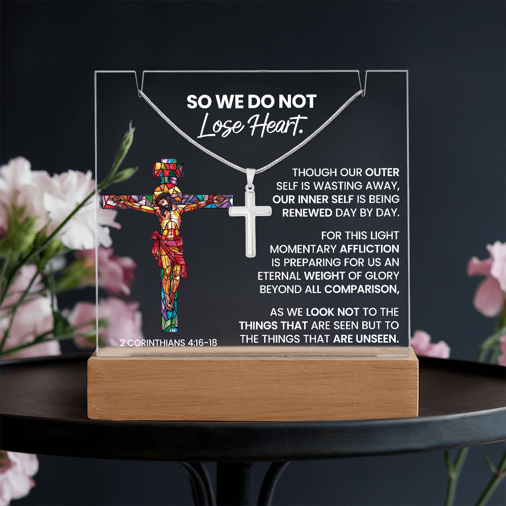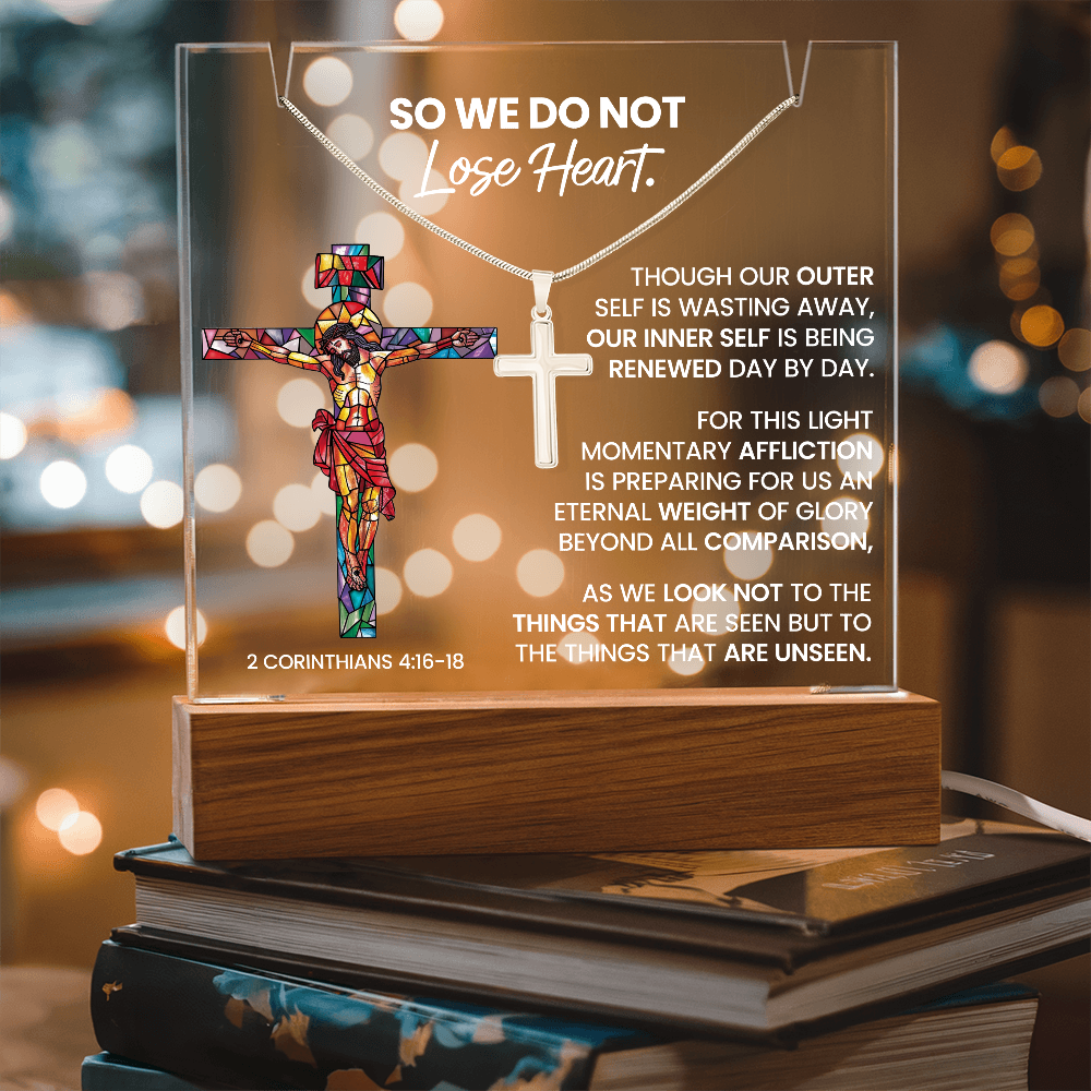 Celebrate love and gratitude with our Keepsake Acrylic Bundle, pairing a brilliant Square Acrylic—engraved with our unique design and an uplifting passage from 2 Corinthians 4:16-18—with the graceful artisan Cross Necklace. The crystal-clear acrylic becomes a striking focal point in any room, while the charming necklace adds a timeless touch of faith. Whether it’s for an anniversary, a birthday, or another special occasion, this heartfelt duo makes a lasting impression you’ll cherish for years to come.