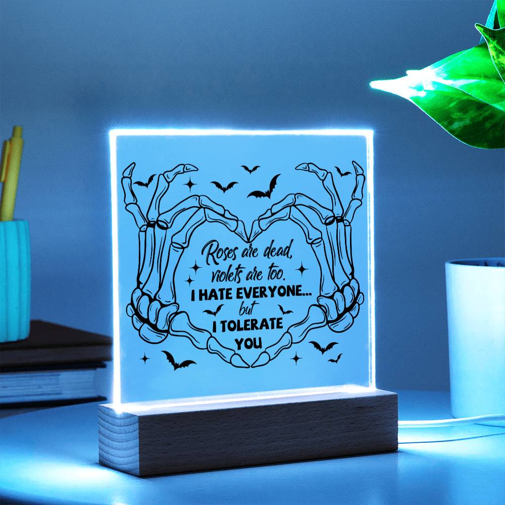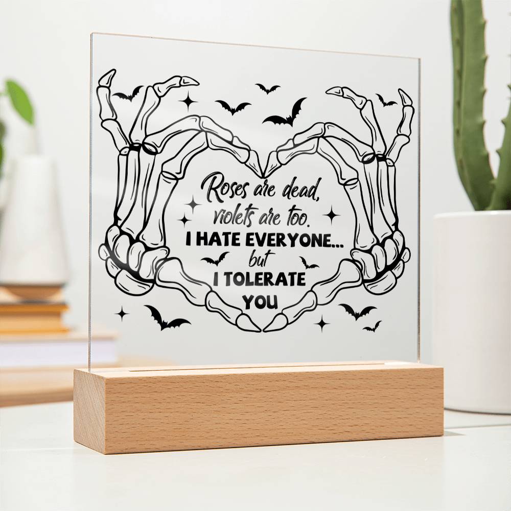 🪄 Cast a spell of charm and whimsy on your Halloween decor with this enchanting plaque that's sure to brew up some spooky laughter. Featuring the spellbinding phrase, "Roses are dead, violets are too. I have everyone... but I tolerate you" it's the perfect way to set the stage for a wickedly good time. 🎃👻