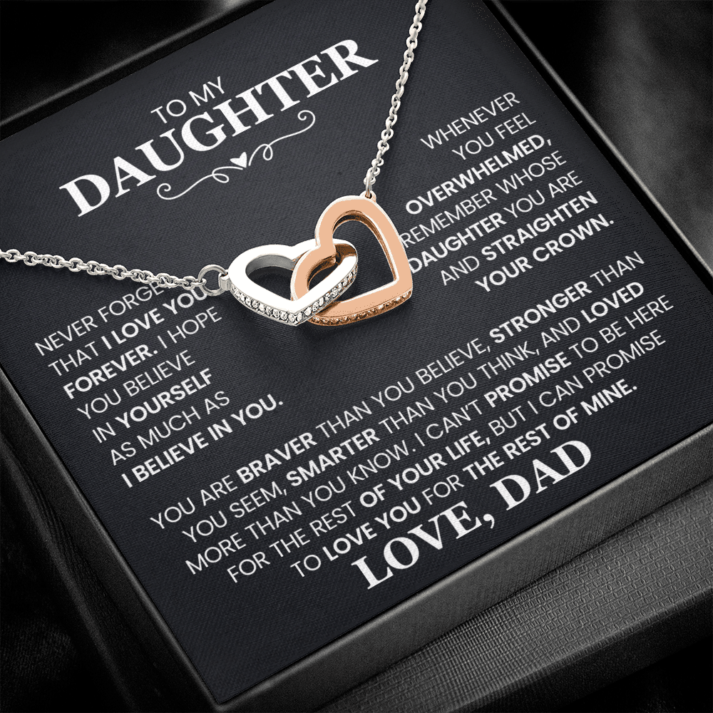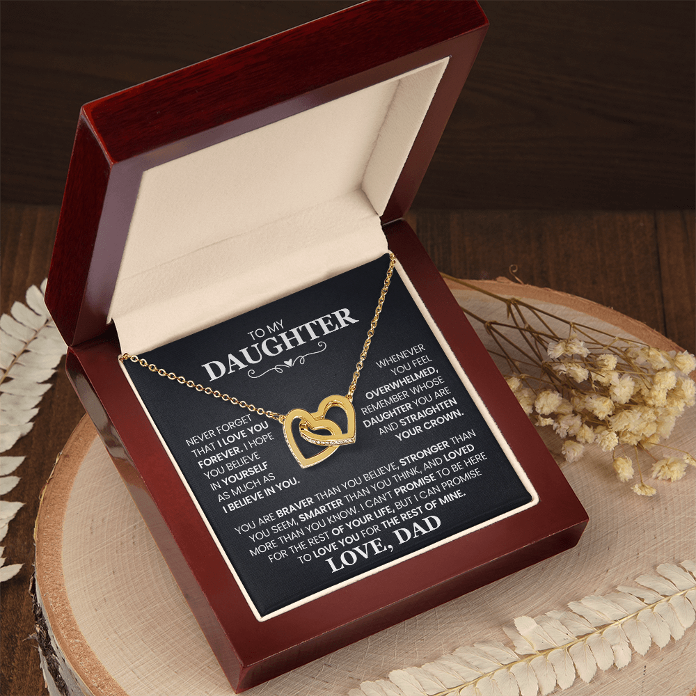 Give your daughter a heartfelt reminder of your unconditional love with this stunning Interlocking Hearts Necklace. Engraved with a touching message from Dad, this elegant piece symbolizes the unbreakable bond between a father and his daughter.