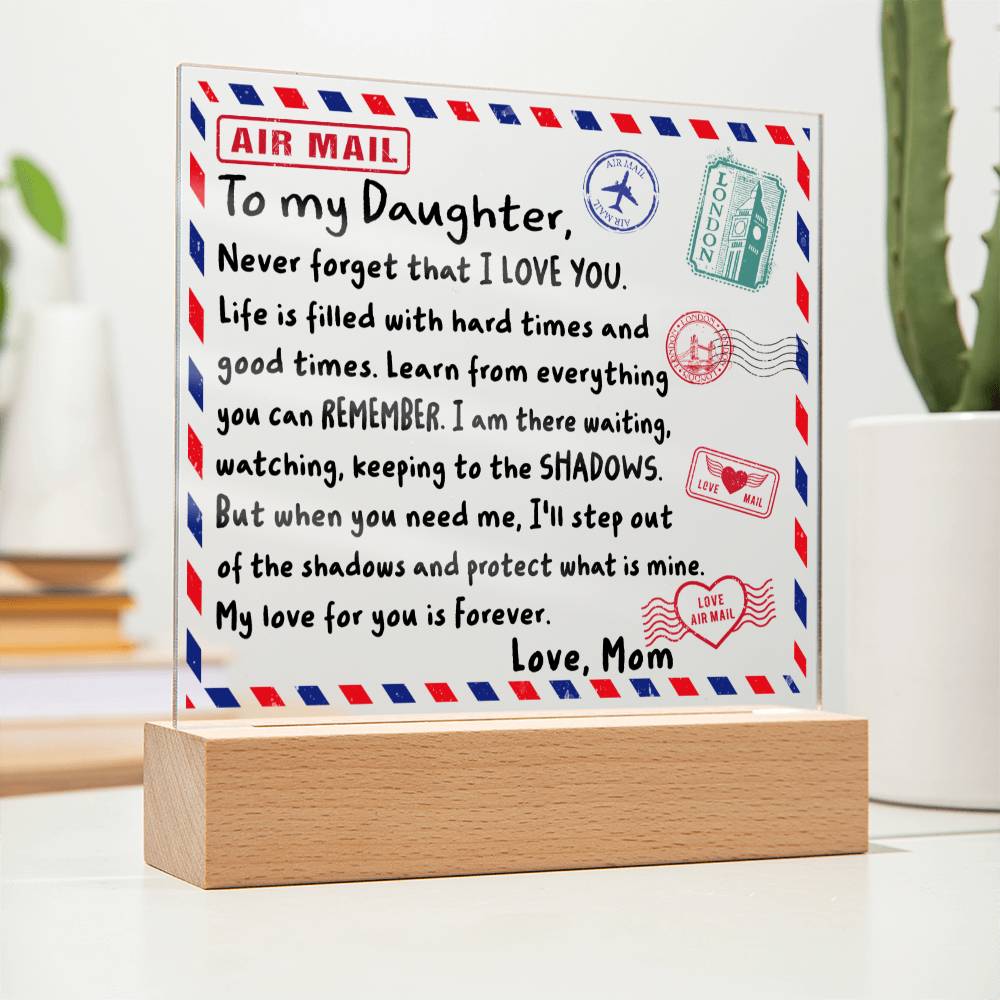 Heartwarming message to your Daughter reads: "To My Daughter: Never forget that I love you. Life is filled with hard times and good times., Learn from everything you can remember. I am there waiting, watching, keeping to the shadows. But when you need me, I'll step out of the shadows and protect what is mind. my love for you is forever. Love, Mom"