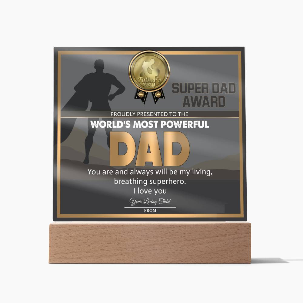 Our beautiful acrylic display plaque features a heartfelt message that will touch his heart. The message reads: "Father's Day Super Dad Award proudly presented to the world's most powerful Dad. You are and always will be my living, breathing superhero. I love you. From your loving child". Order now and let your Dad know that he is loved and appreciated!